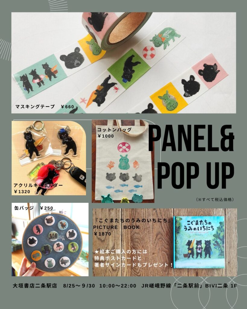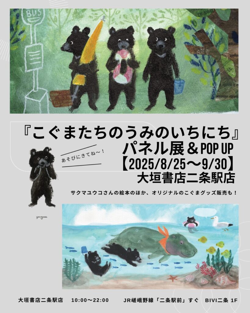 京都・大垣書店二条駅店さんの児童書コーナーで、『こぐまたちのうみのいちにち』のパネルと、こぐまたちのオリジナルグッズを販売するPOP UPコーナーを展開いただきます!